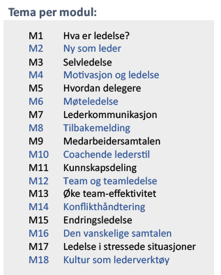 Kursene kan være frittstående eller inngå som et større lederprogram for kunden. Vi etablerer ofte egne «lederskoler» for kundene. En lederskole innebærer et program som varer eksempelvis over et år. Der ledere utfordres til å definere utviklingsmål, motta feedback og trene på konkret definert atferd. Delta på samlinger, lede litteratur og ledelses artikler.