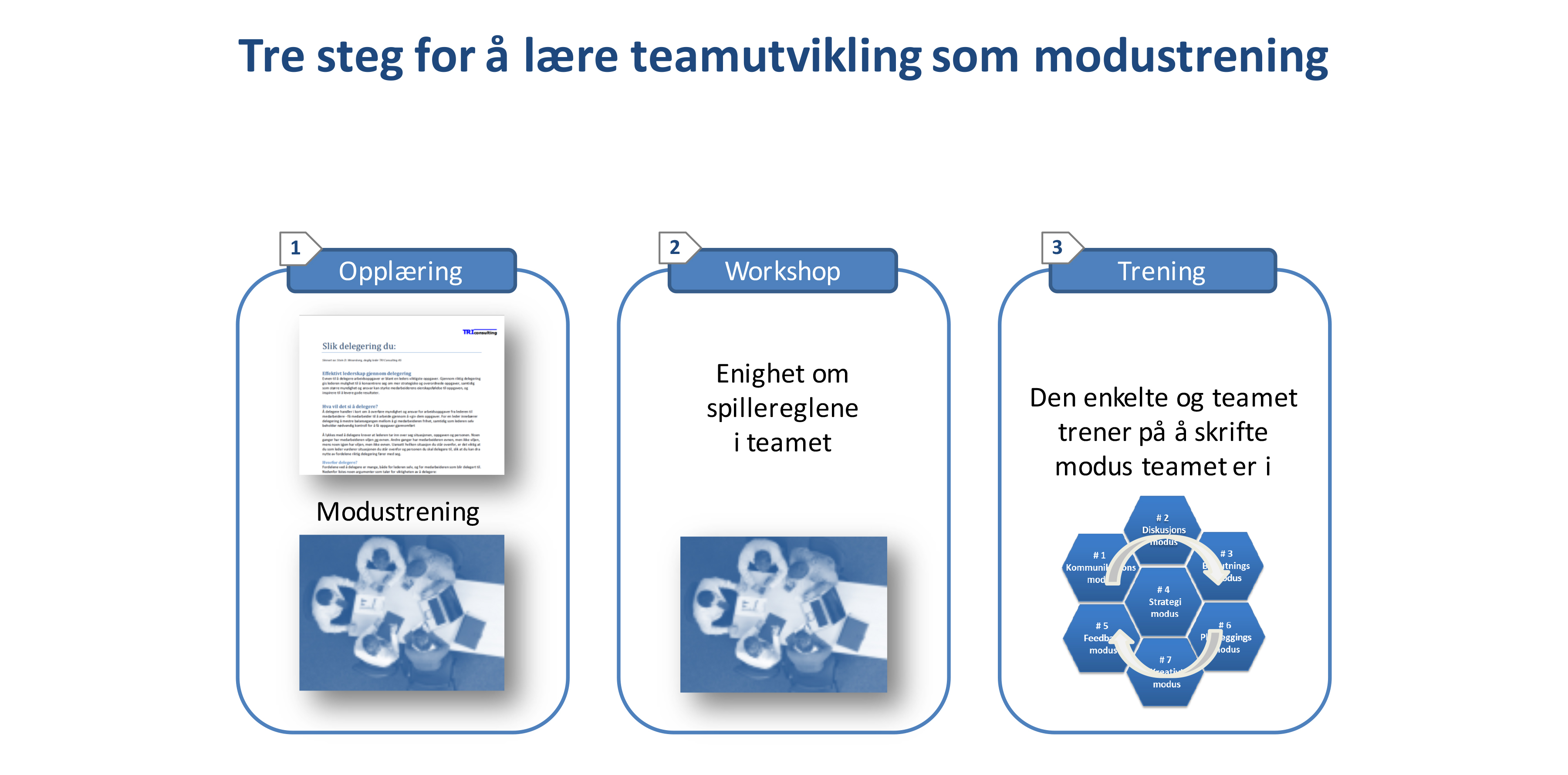 For å lykkes med endringer må arbeidsteamene fungere optimalt. Vi utvikler effektive team som svarer på omgivelsenes krav. Vårt begrep er teamutvikling som modustrening. Team trenes opp i ulike modus og hvordan de skal skifte hurtig mellom modus. Målet er et kontinuerlig fokus på hva som er rett modus i en gitt situasjon. Dette krever helt nytt fokus på informasjonsflyt i organisasjonen og i arbeidsteamene.