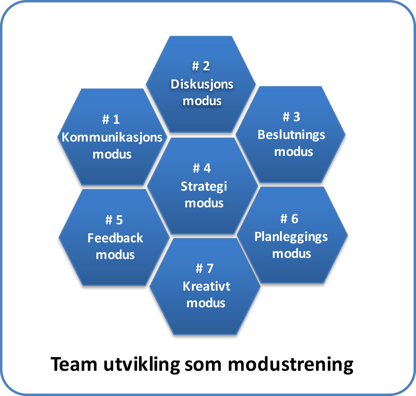 For å lykkes med endringer må arbeidsteamene fungere optimalt. Vi utvikler effektive team som svarer på omgivelsenes krav. Vårt begrep er teamutvikling som modustrening. Team trenes opp i ulike modus og hvordan de skal skifte hurtig mellom modus. Målet er et kontinuerlig fokus på hva som er rett modus i en gitt situasjon. Dette krever helt nytt fokus på informasjonsflyt i organisasjonen og i arbeidsteamene.